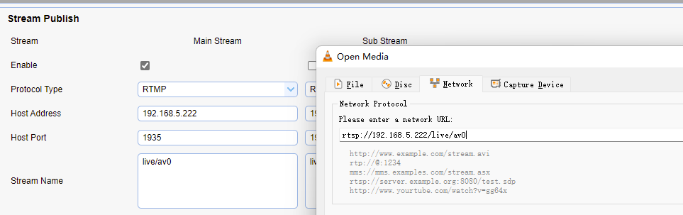 It consists of rtsp ://camera IP address/Stream name.