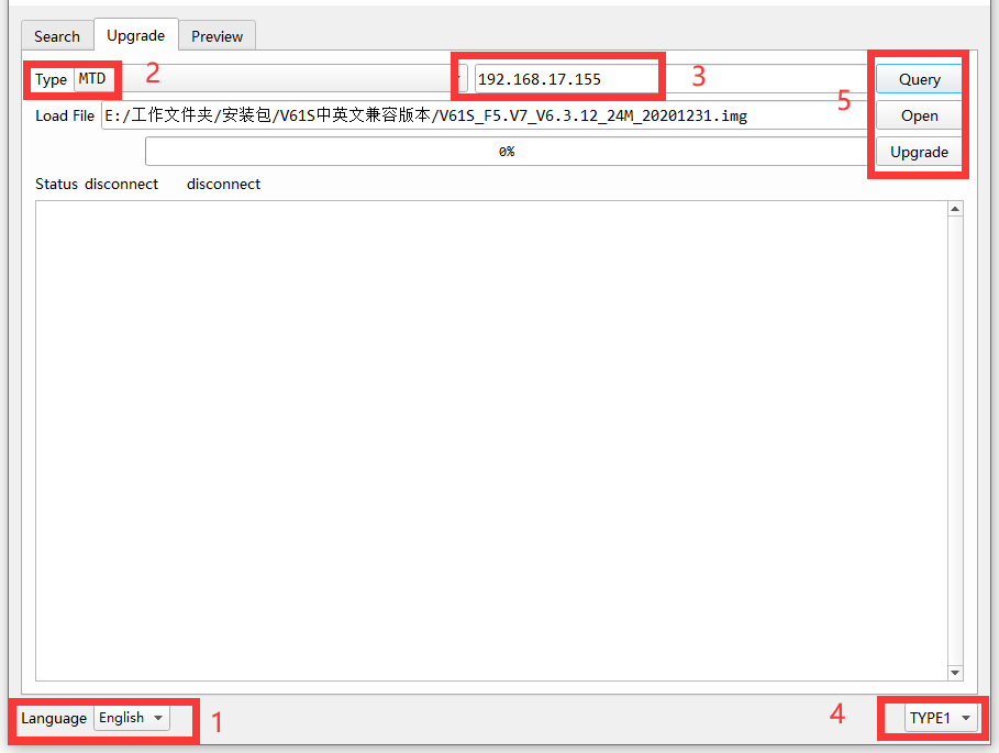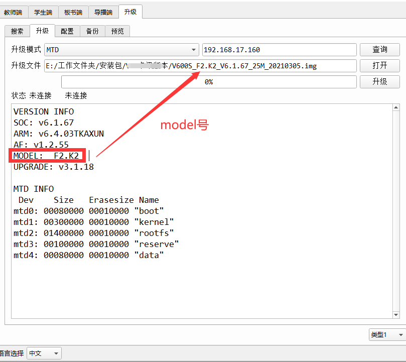 In the upgrade interface, you can switch between tool languages in the Language interface;When upgrading, Type must select MTD mode and Type 1 in the bottom right corner; Make sure the camera IP is correct for the current upgrade, then click Query to get the current version information.