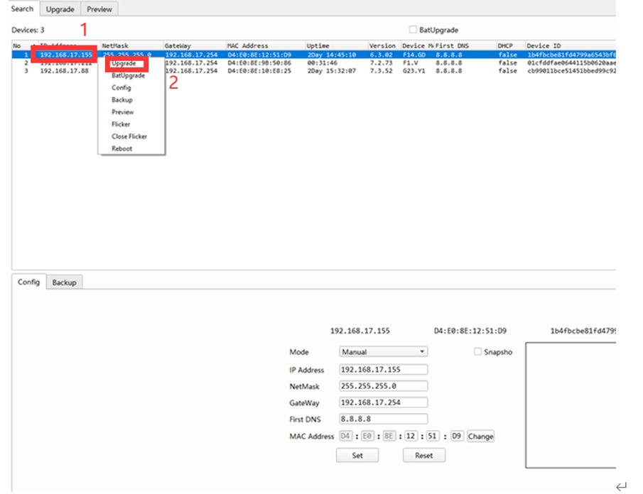 Once the camera is rebooted, you can use the tool again to search for the camera and select the one you want to upgrade; Right-click and select upgrade;