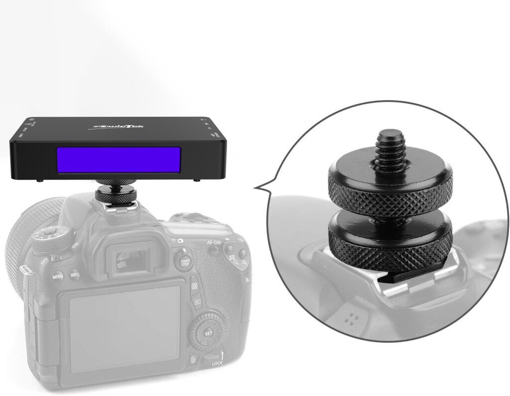 First, install the cold shoe on the camera, and then find the cold shoe mounting hole at the bottom of the ZowieBox to install it on the camera.