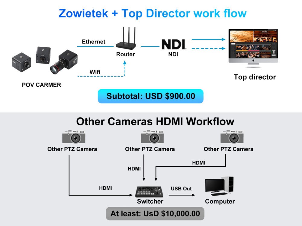 With NDI protocol, the integration of ZowieTek 4K POV Camera and TopDirector provides a professional-level live production experience without the need for expensive hardware or complex setups. It reduces both equipment and operational costs, making it ideal for creators and teams with budget constraints.
