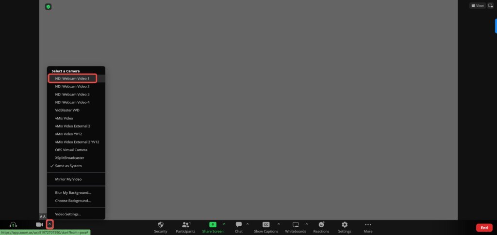4、In the zoom meeting, choose to open the video and click the triangle button on the right side of the video to select the NDI signal source just set.