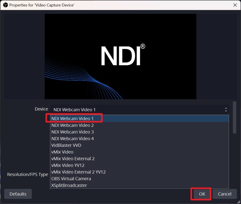 Select the NDI Webcam that has just been configured and click OK.