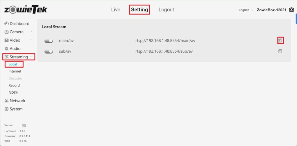 1. Log in to the web console of ZowieBox, click Setting->Streaming->Local. Click the copy button on the right to copy the streaming address of the local stream.