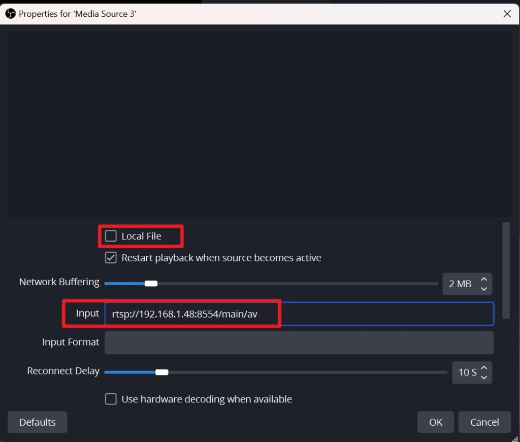 3. Deselect the Local File and paste the local stream URL into the Input and click OK.