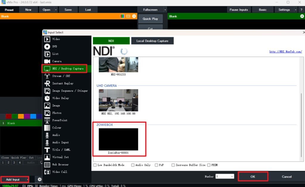 Open the vMix software, click the Add Input button in the lower right corner, click NDI/Desktop Capture in the pop-up window, select the required NDI stream and click OK.