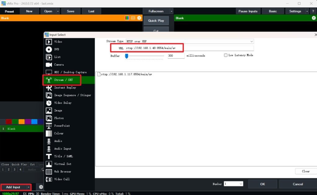Open the vMix software, click Add Input on the lower left side, click Stream / SRT in the pop-up window, paste the local stream address just copied into the URL box, and click OK.