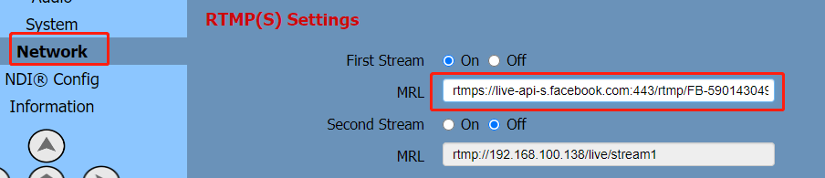 Log in to the camera’s web interface. Then go to the “Network” tab. Copy as Stream URL + Stream Key (Please note: the key above is an example and will not work for you). The final result is seen in the image below.