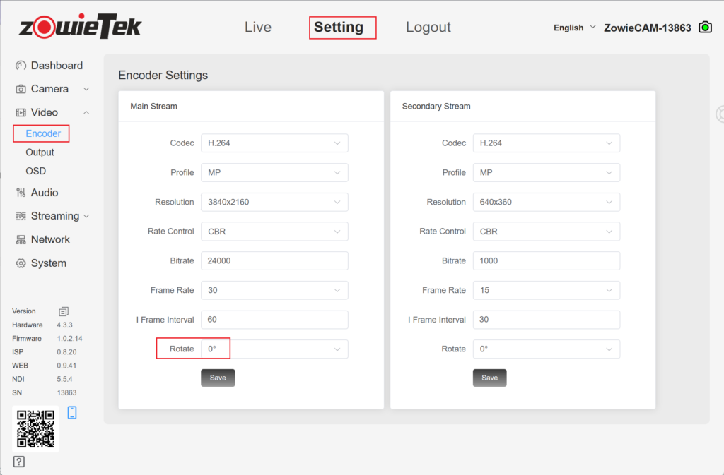 Log in to the web console and click Setting->Video->Encoder. Select the angle you want to rotate and click Save. Video encoding will rotate in a clockwise direction.