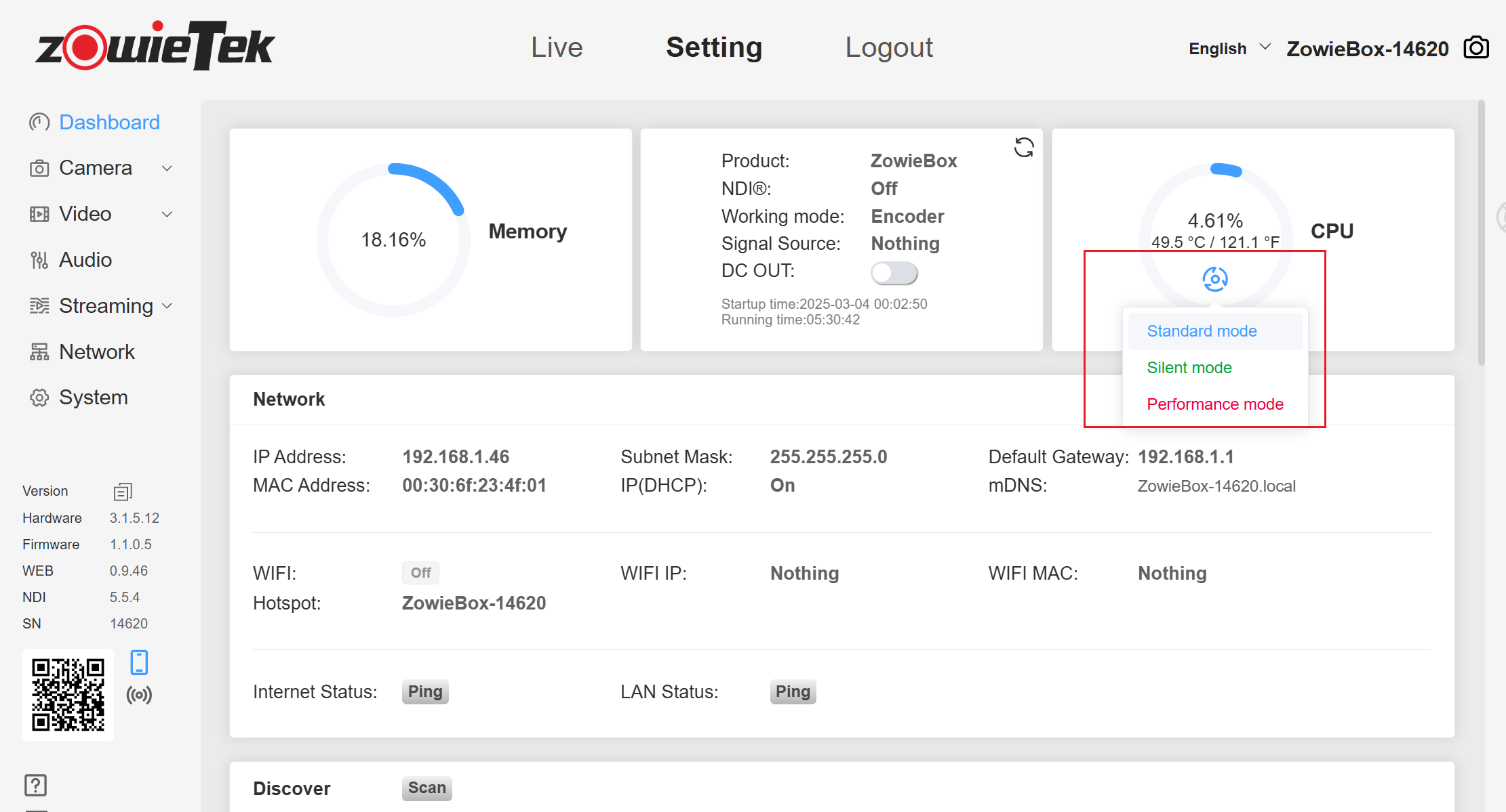 Log in to the ZowieBox webpage and view the CPU temperature of the device in the Dashboard.