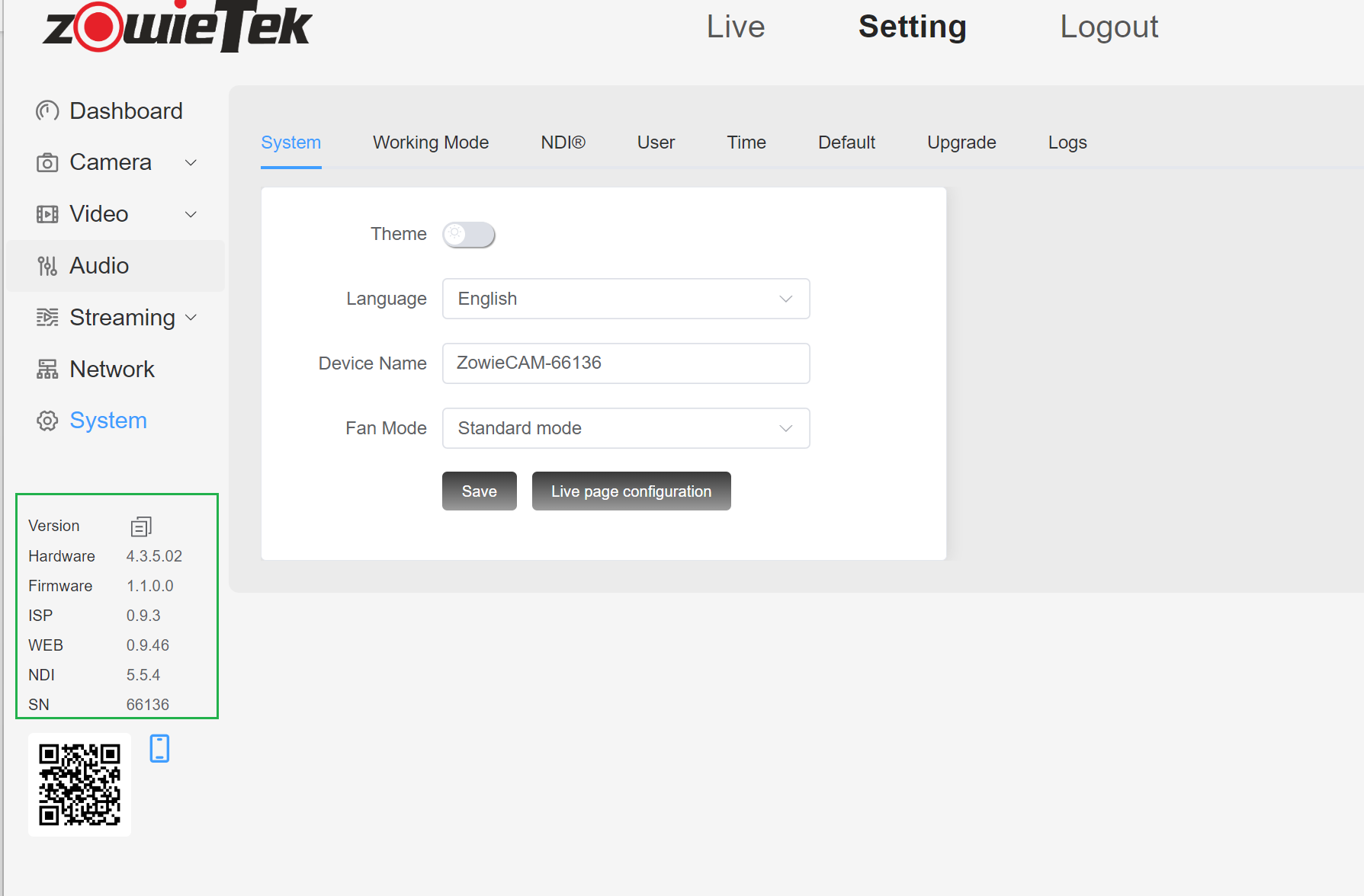 Please log in to the web console and click Setting to view the current hardware version of ZowieCam. Hardware versions 4.x.7, 4.x.11, 4.x.y.02 (x:1~4) can control the fan speed.