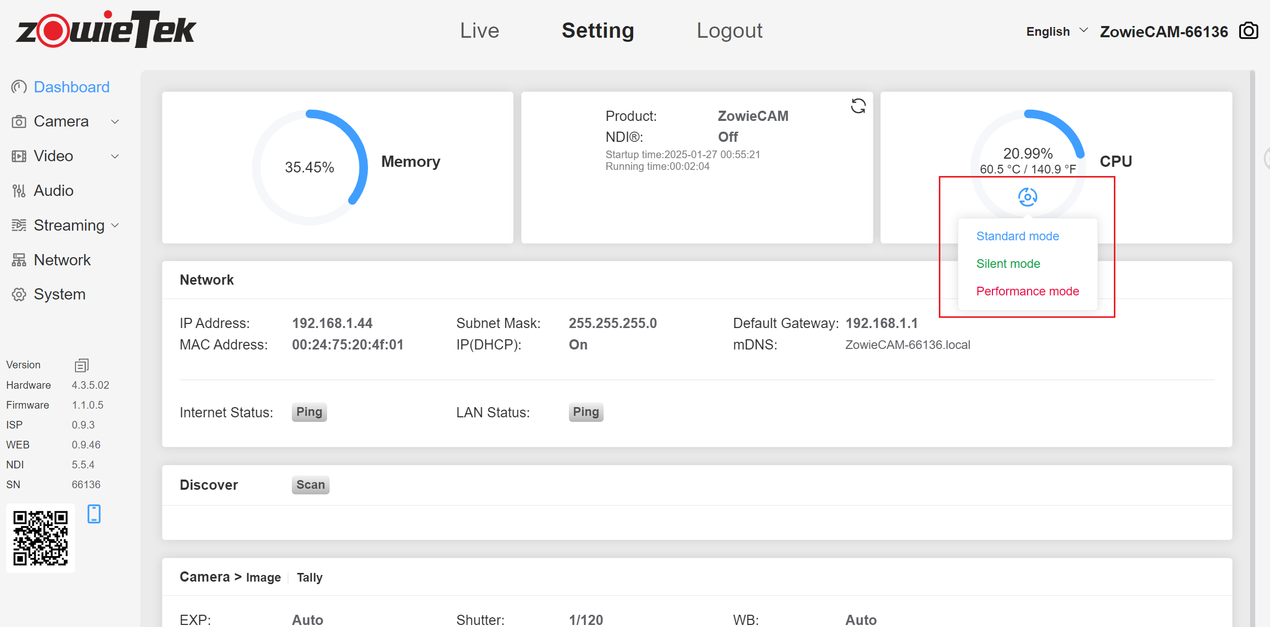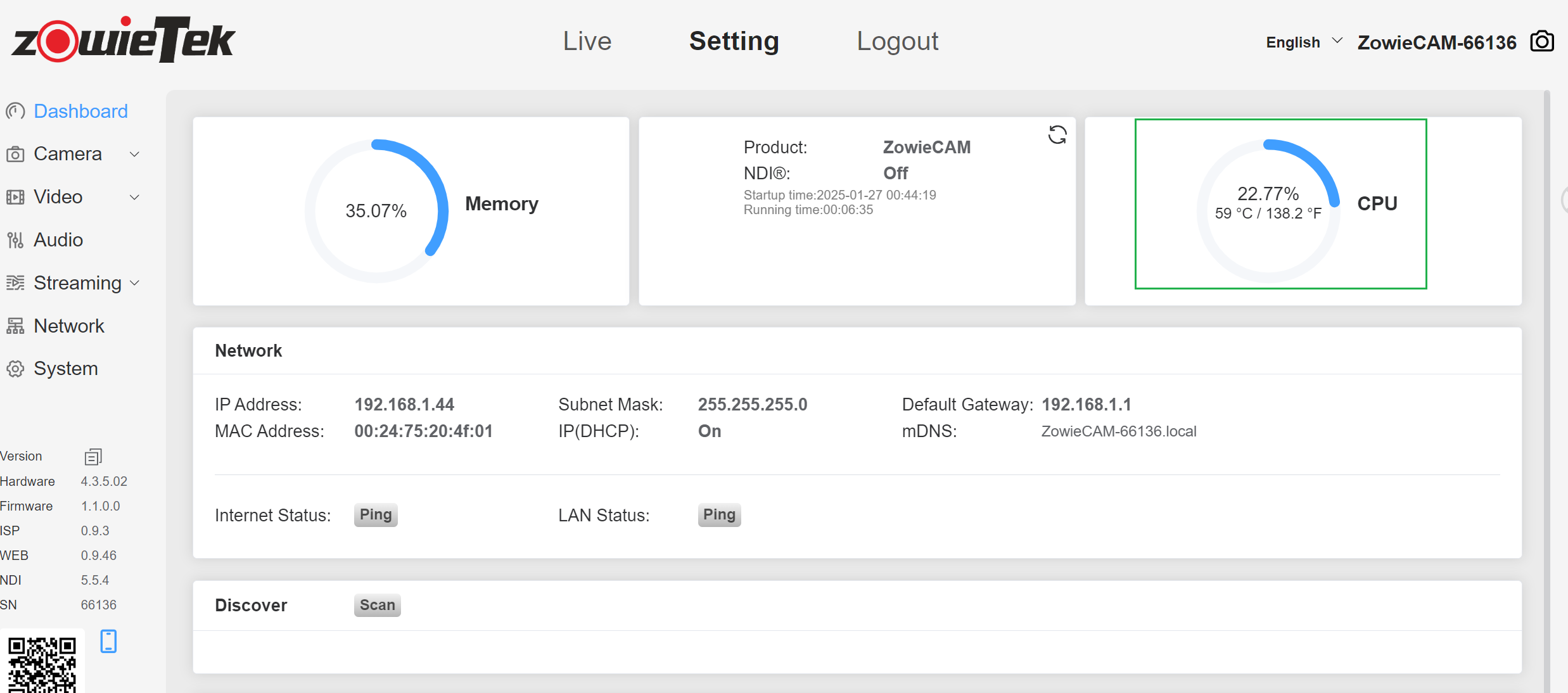 Log in to the ZowieCam webpage and view the CPU temperature of the device in the Dashboard.