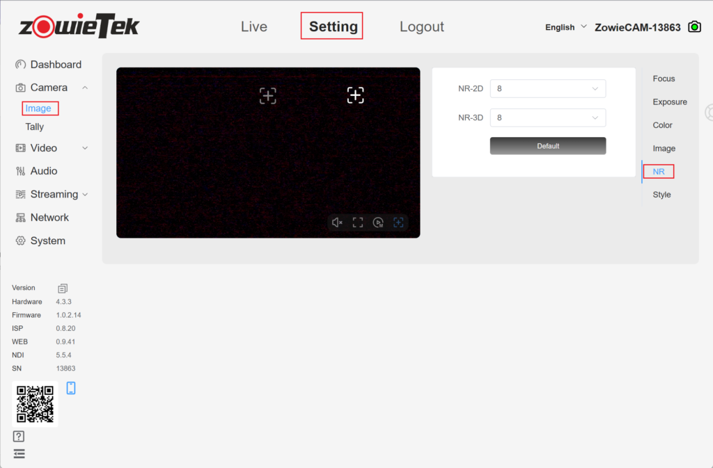 Method 1: Log in to the web console, click Setting->Camera->Image->NR, and select the required noise reduction level for noise reduction. The higher the level, the stronger the noise reduction.