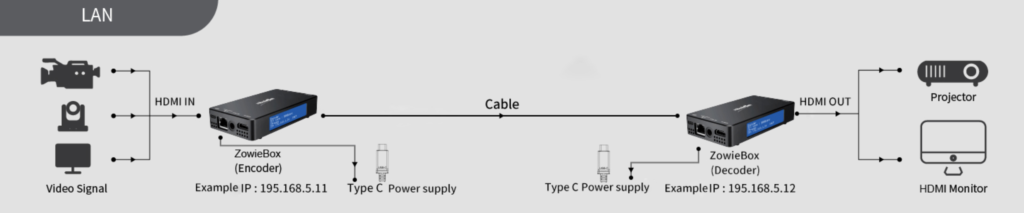 Please prepare two ZowieBox for point-to-point video transmitter and receiver. One acts as an encoder (eg: 192.168.5.11) to convert the HDMI input signal source to NDI, and the other acts as a decoder (eg: 192.168.5.12) to decode the NDI source and output it to the display.
