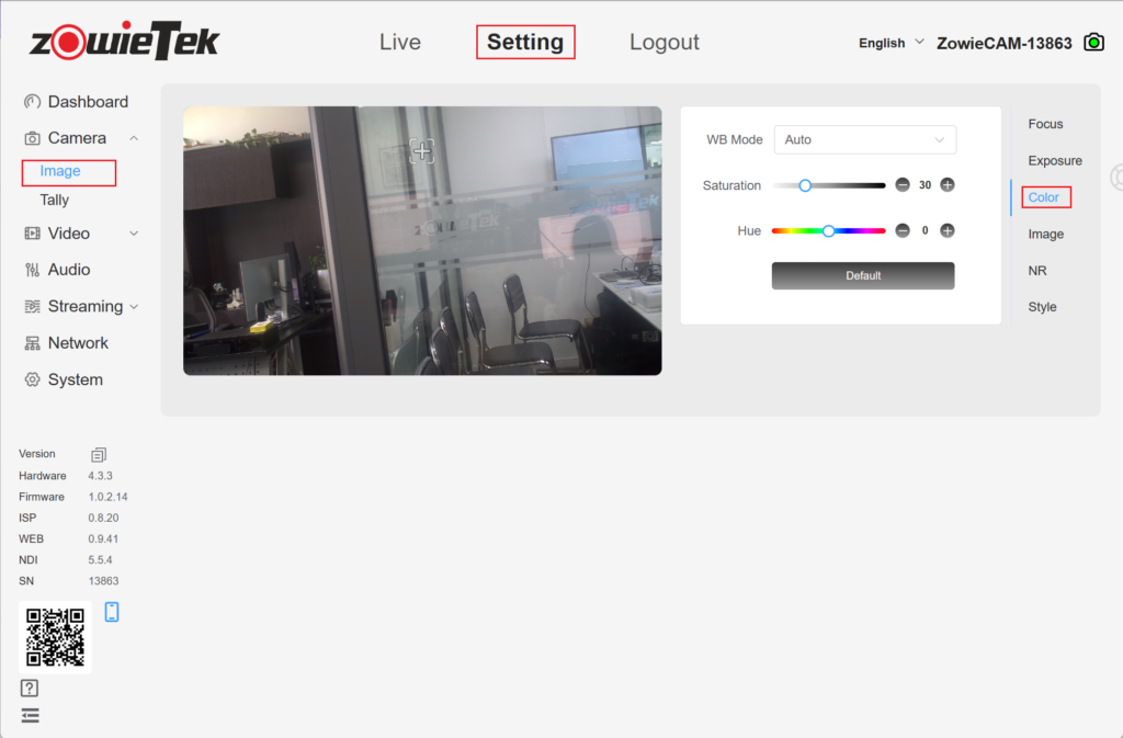 Method 1: Log in to the web console and click Setting->Camera->Image->Color.
