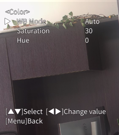 Method 2: Click the OSD button to enter the OSD menu, enter [Camera]->[Color], and set the white balance mode to Auto. Set the Saturation to 30 and the Hue to 0.