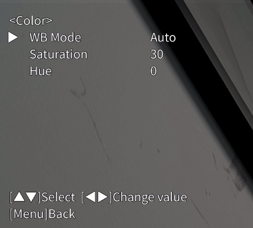 Click the Menu button on the IR remote control to call out the OSD menu, click [Camera]->[Color], set the white balance mode to Auto, saturation to 30, and hue to 0.