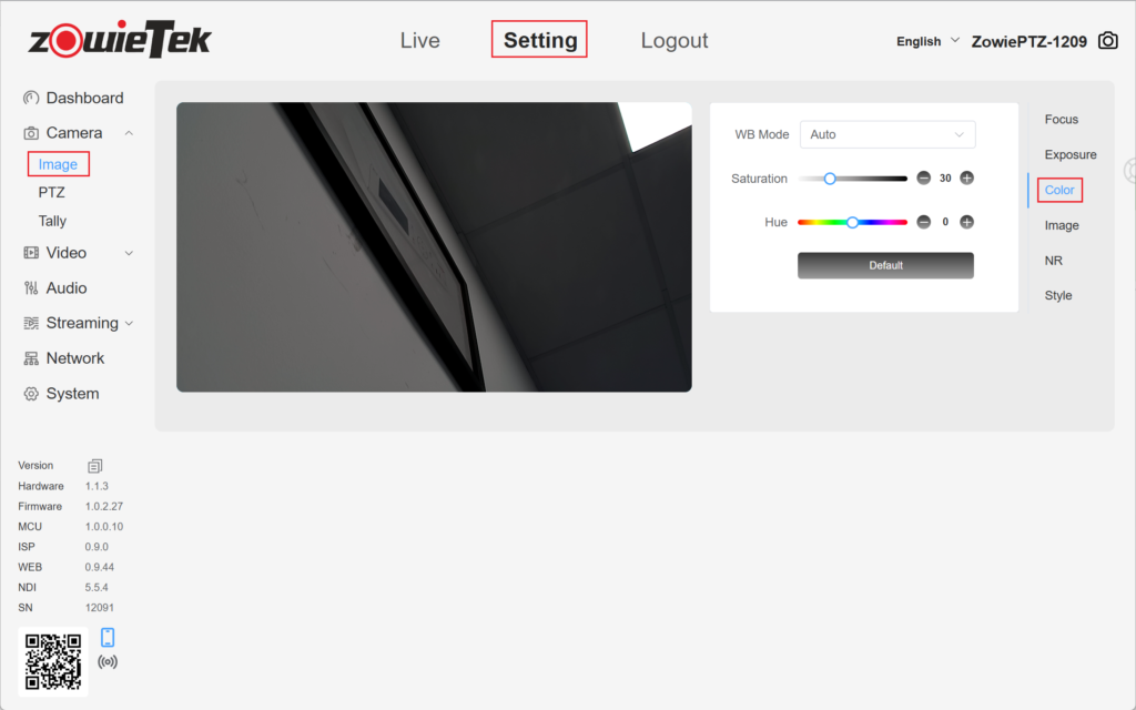 After logging into the web control interface, click Setting->Camera->Image->Color, set the white balance mode to auto, saturation to 30, and hue to 0.