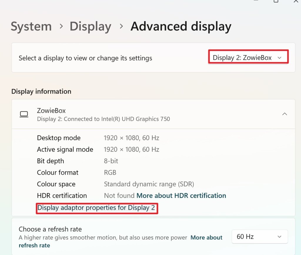 Change the display screen that needs to be modified to ZowieBox, and then click Display Adapter Properties.