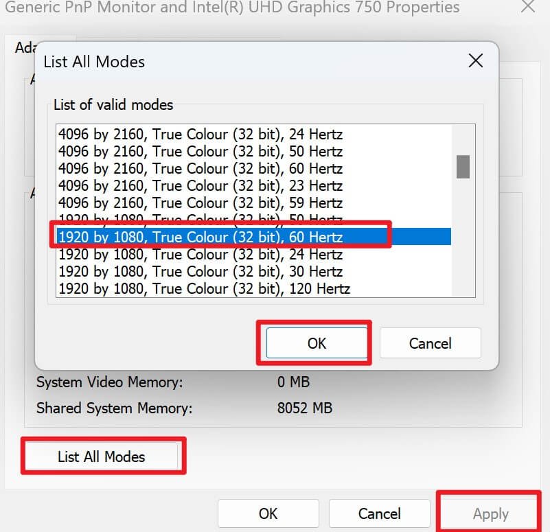 In the pop-up window, select to List All Modes, then select the required resolution and frame rate, and click OK and Apply.