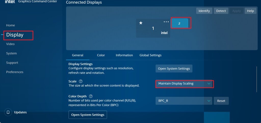Click on the Display, select the monitor serial number corresponding to ZowieBox, change the scale parameters to maintain display scaling, and click Save.