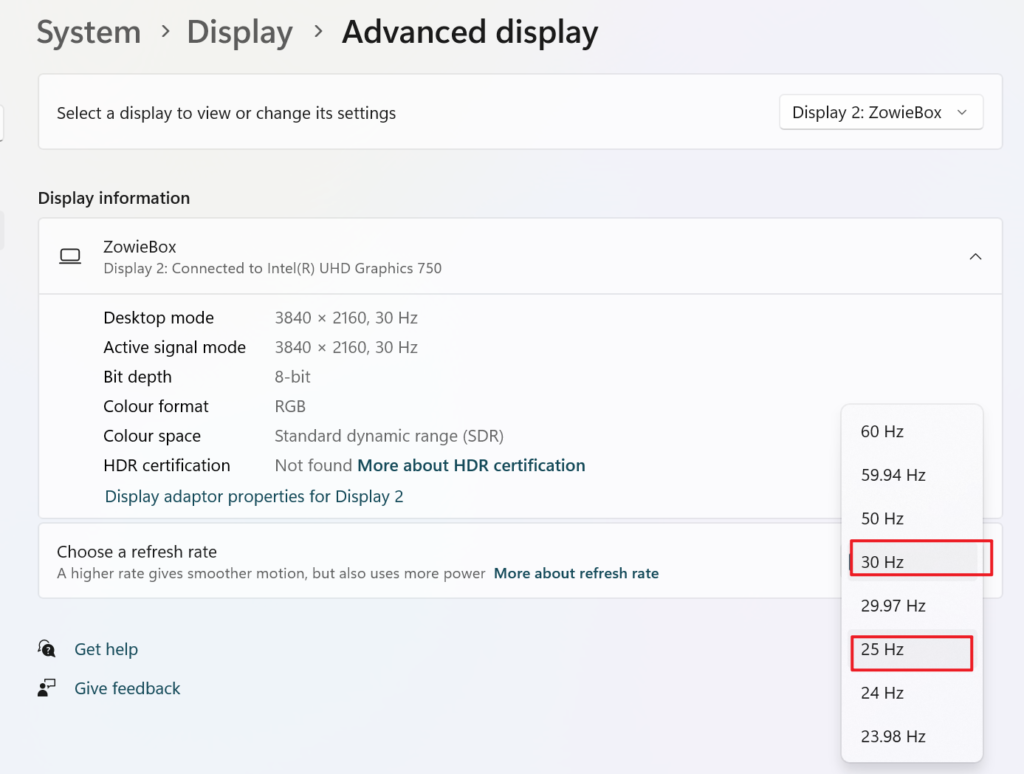 If ZowieBox still shows that the resolution is not supported after setting the above parameters, please switch the frame rate to 30/25 frames.