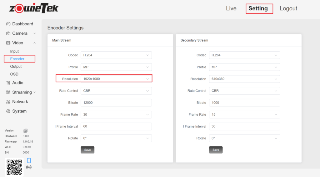 If after switching the frame rate to 30/25 frames, ZowieBox successfully detects the resolution, but the actual detected resolution is inconsistent with the set resolution, please log into the ZowieBox web console, click Setting ->Encoder, and modify the encoding resolution. Â (This method cannot encode a 30-frame signal into a 60-frame signal.)