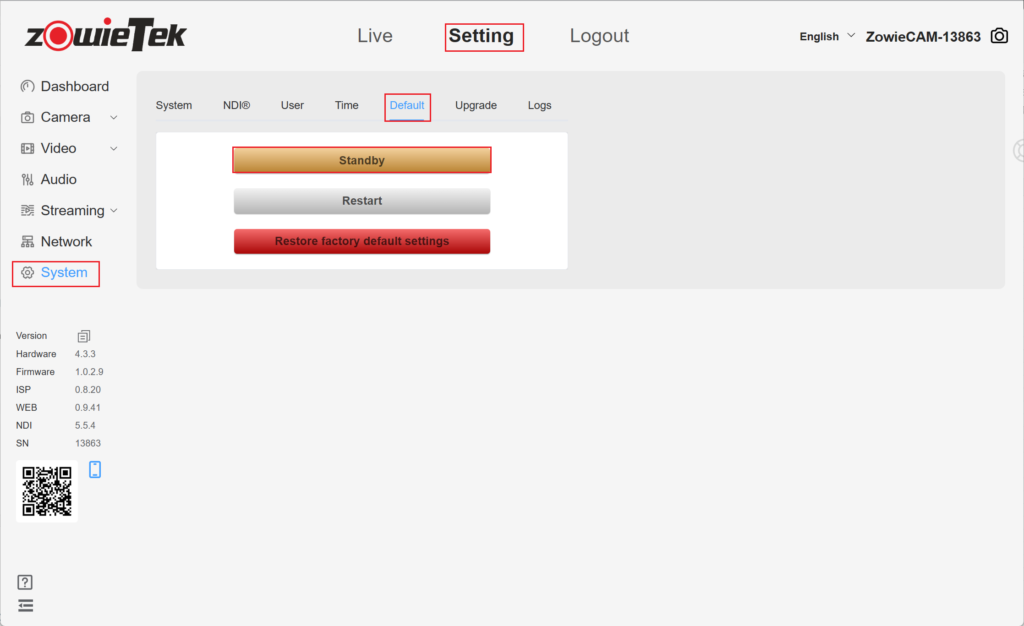 Method 2: After logging in to the web console, click Setting->System->Default->Standby.