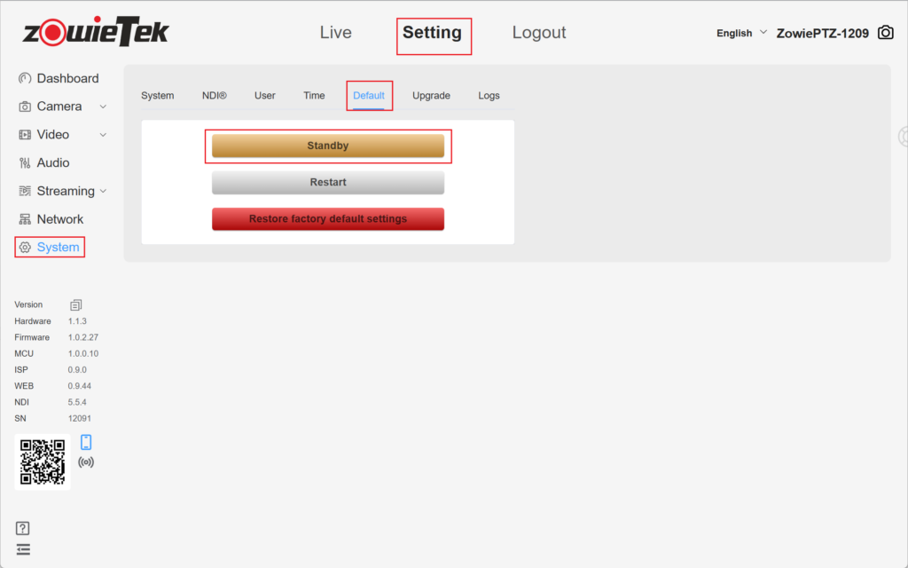 Log in to the web console and click Setting->System->Default->Standby.