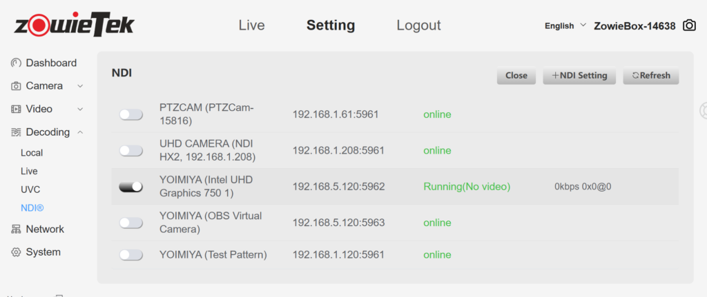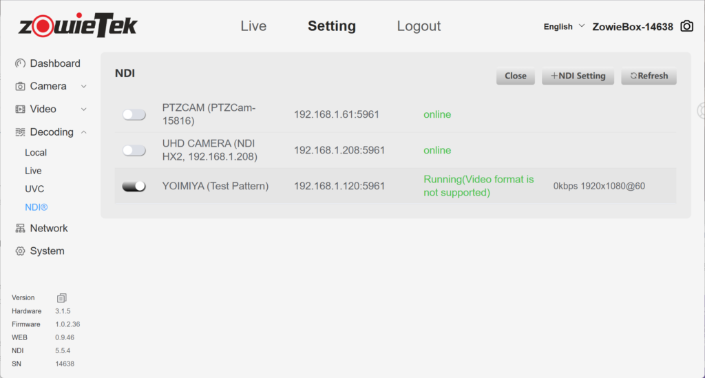 If decoding NDI fails, please log in to ZowieBox first, click Setting->Decoding ->NDI to view its prompt information.
