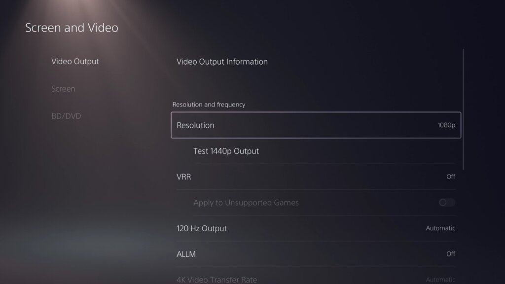 2、Enter the PS5 system settings interface, click Screen and Video, and switch the resolution to 1080p in the Video Output.