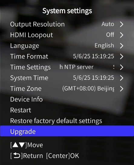 - Click to enter the system settings and select upgrade. After clicking confirm, do not unplug the USB drive or turn off the power of the device.