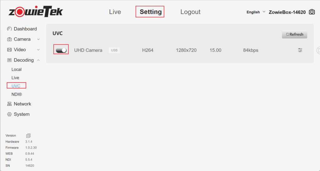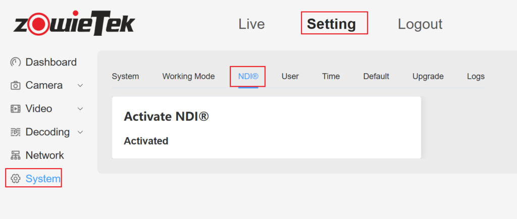 After logging in to the ZowieBox web console, click Setting->System->NDI to check whether NDI is activated.
