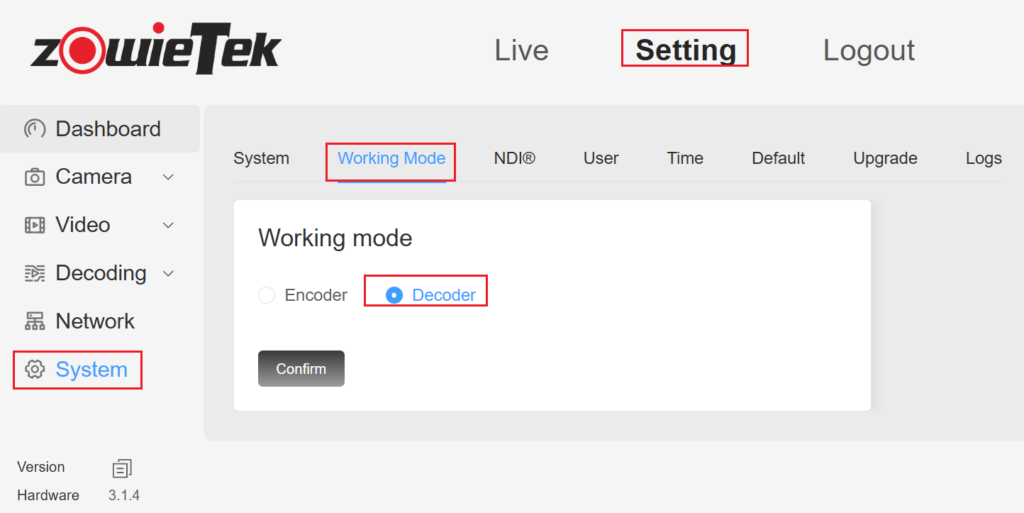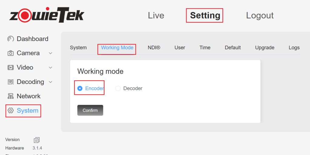 - Click Setting->System ->Working Mode to switch the working mode of ZowieBox to encoding mode.