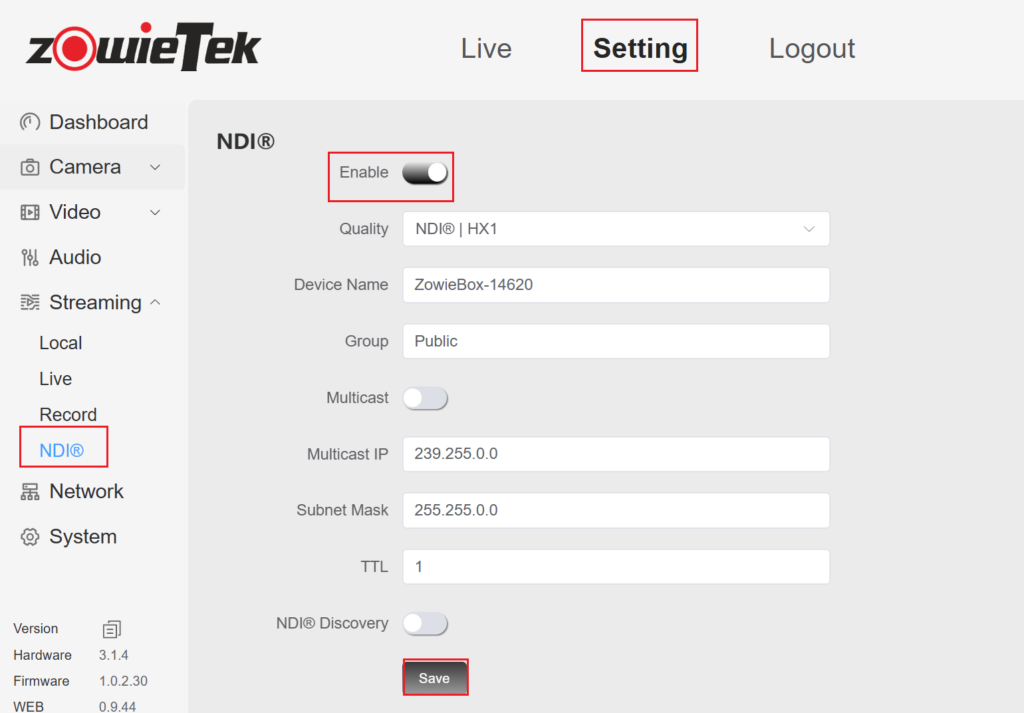 - Click Setting->Streaming ->NDI. Turn on the NDI, click Save and restart ZowieBox. (If it prompts that the opening fails, please insert the HDMI signal first)