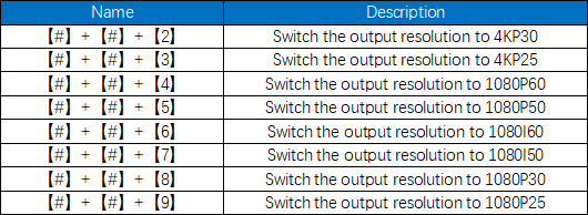 Use the IR remote control shortcut keys to directly change the output resolution. The shortcut keys are shown in the following table: