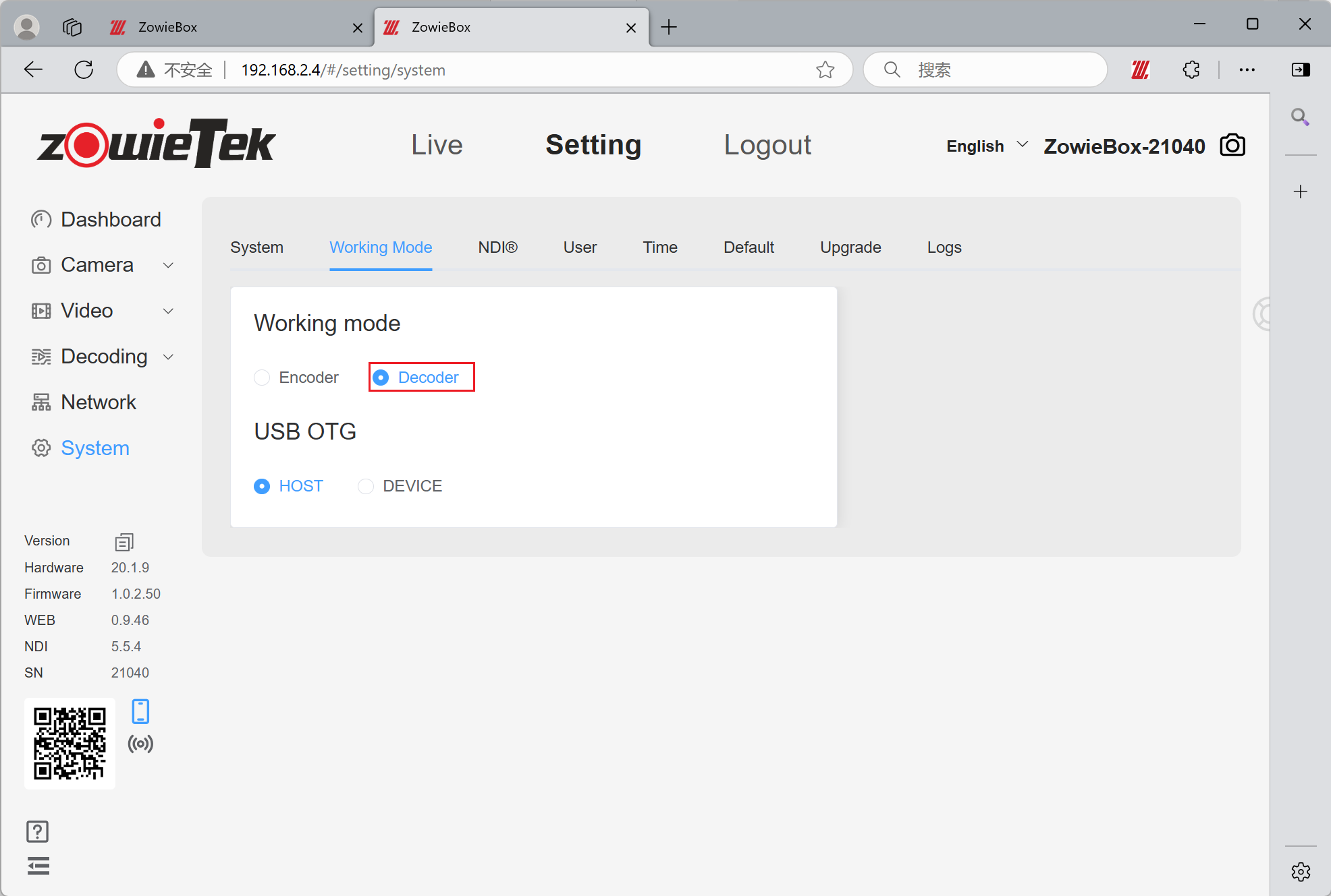Log in to the web console of the decoding device (e.g:192.168.2.4), click Setting->System ->Working Mode, and switch the working mode to decoder.