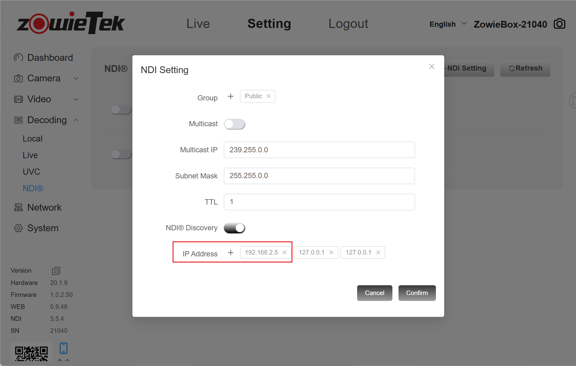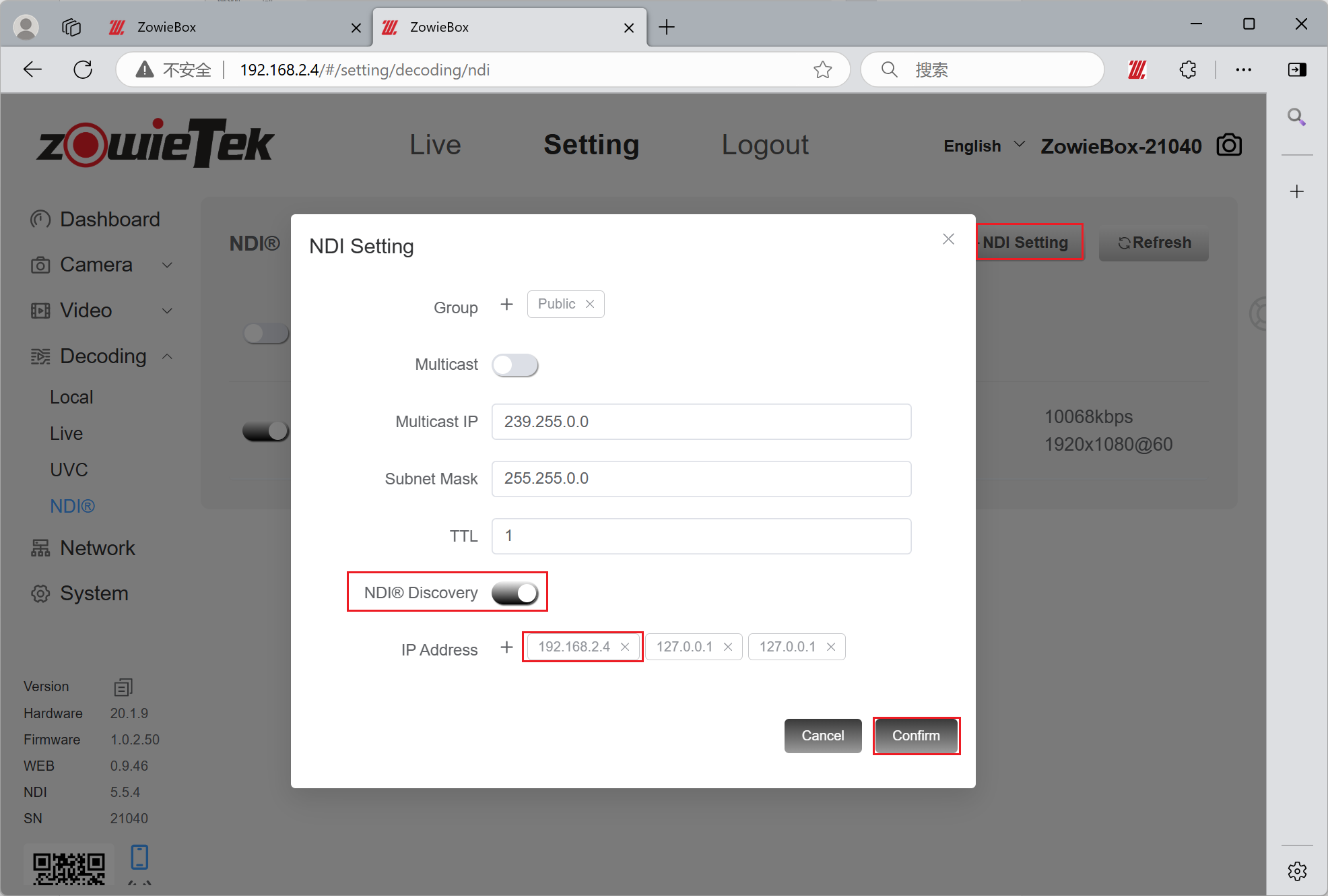 Click Setting->Decoding ->NDI. Click +NDI Setting. Open the NDI Discovery button below, enter your own IP in the IP address (192.168.2.4) and click Confirm.