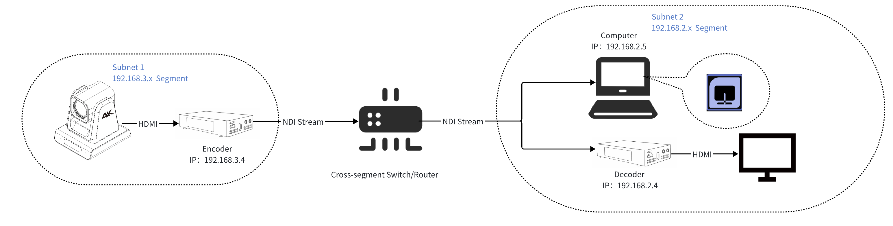 For LANs with multiple subnets or without mDNS, Zowietek series products (ZowieCam, ZowiePTZ, ZowieBox) support NDI discovery server after version 1.0.2.30 to achieve cross-segment encoding and decoding without relying on a computer.