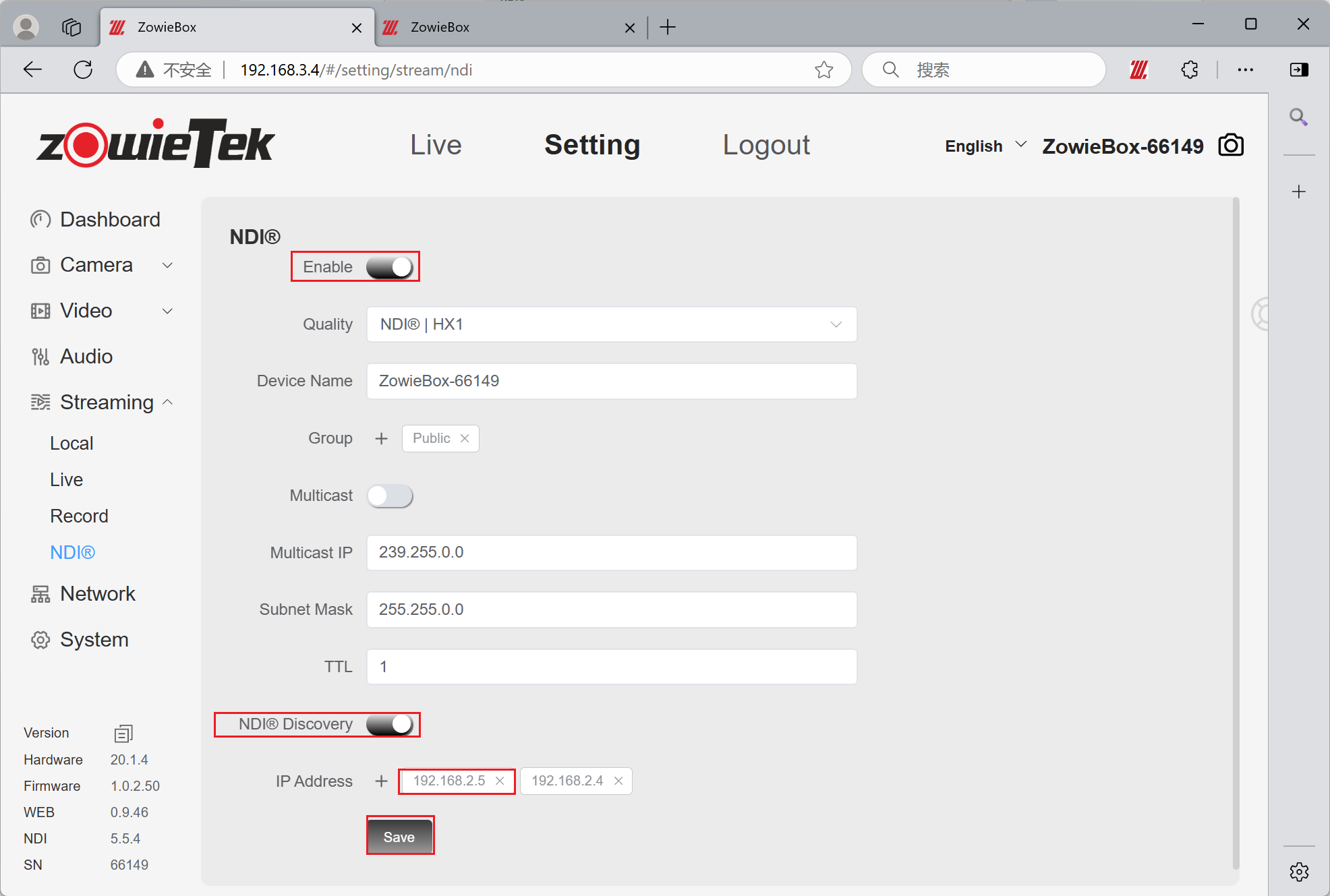 Log in to the web console of the encoding device (e.g:192.168.3.4) and click Setting->Streaming ->NDI. Turn on the NDI switch and turn on the NDI Discovery button. Fill in the IP address of the decoder (e.g:192.168.2.4)
