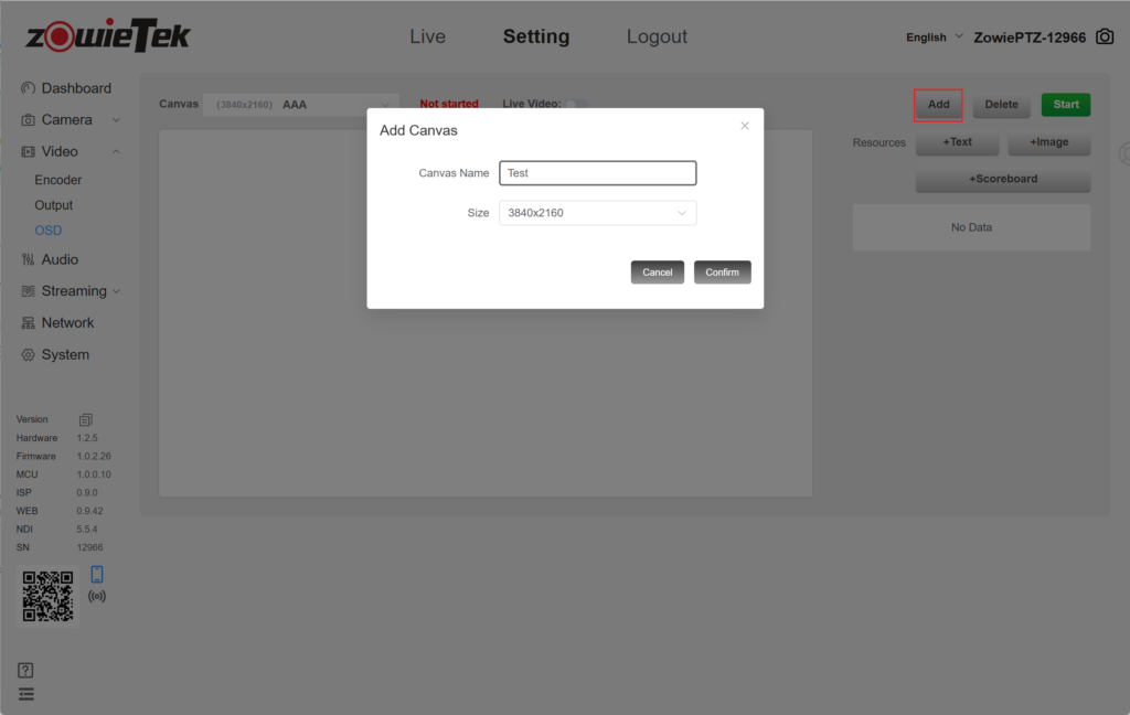 2.Click the Add button on the right to add a canvas, enter the canvas name and size. The canvas size is recommended to be consistent with the encoding resolution.