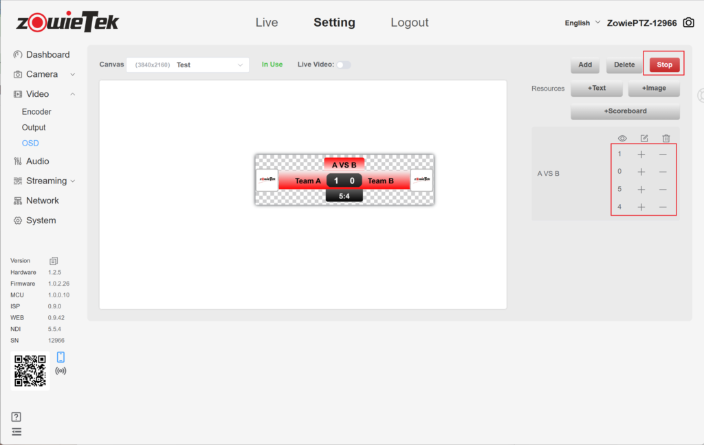 6.After adding successfully, click the button on the right to enable the OSD canvas. Users can use the shortcut button on the right to modify the current score.