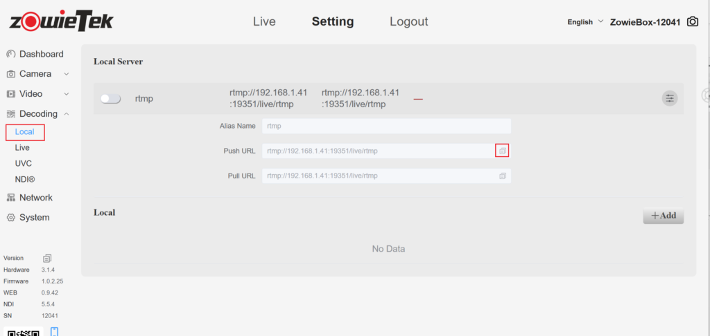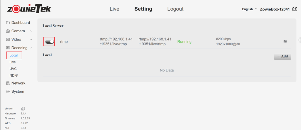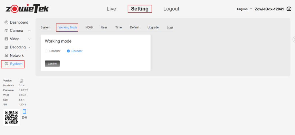 1.Log in to the web console, click Setting->System->Working Mode to switch ZowieBox to decoding mode.