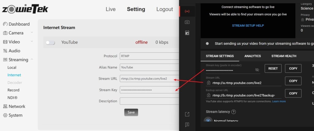 Click the +Add button to add a new network stream. Enter a custom name to facilitate management and enter YouTube’s Stream URL and key into the ZowieBox’ s Stream URL and push key in sequence, as shown in the figure below.