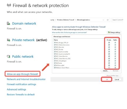 3. Please check whether the computer is using a private network or a public network, and check whether the all the NDI software is allowed to pass in “Allow an app through firewall”.