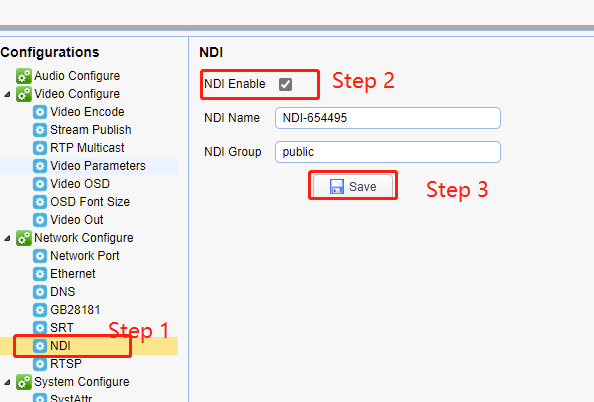 First, make sure your camera is connected to the network. Log in to the camera’s web interface, make sure NDI is enabled. Click on the page in sequence as seen below. You can look up the camera’s NDI name.
