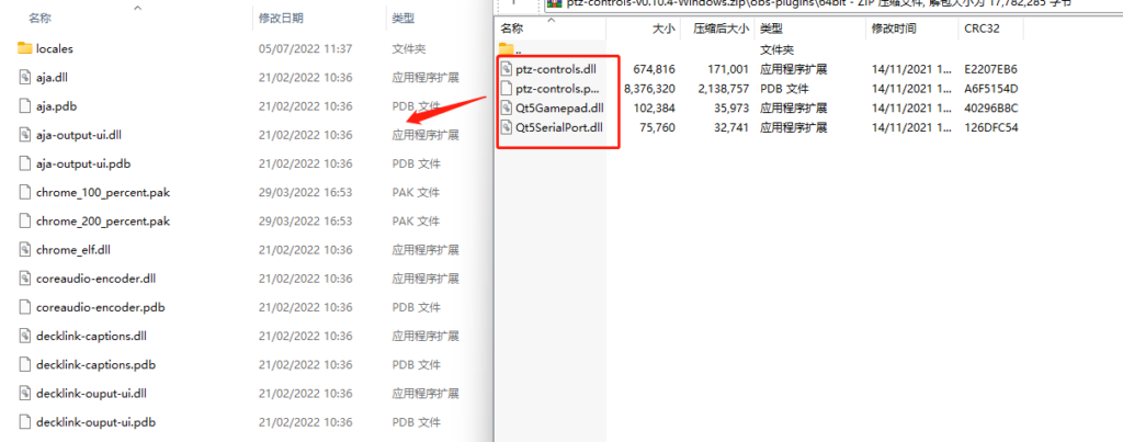 Now go to the OBS plugin folder you downloaded and select all the files seen below and drag them to the obs-plugin folder previously opened also seen below.