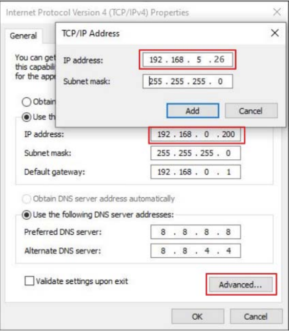 7) Click Advanced. Add a new IP address, whose first three segments are the same as camera factory default IP address (192.168.5.163). Type 192.168.5.26 for example. Subnet mask remains default.