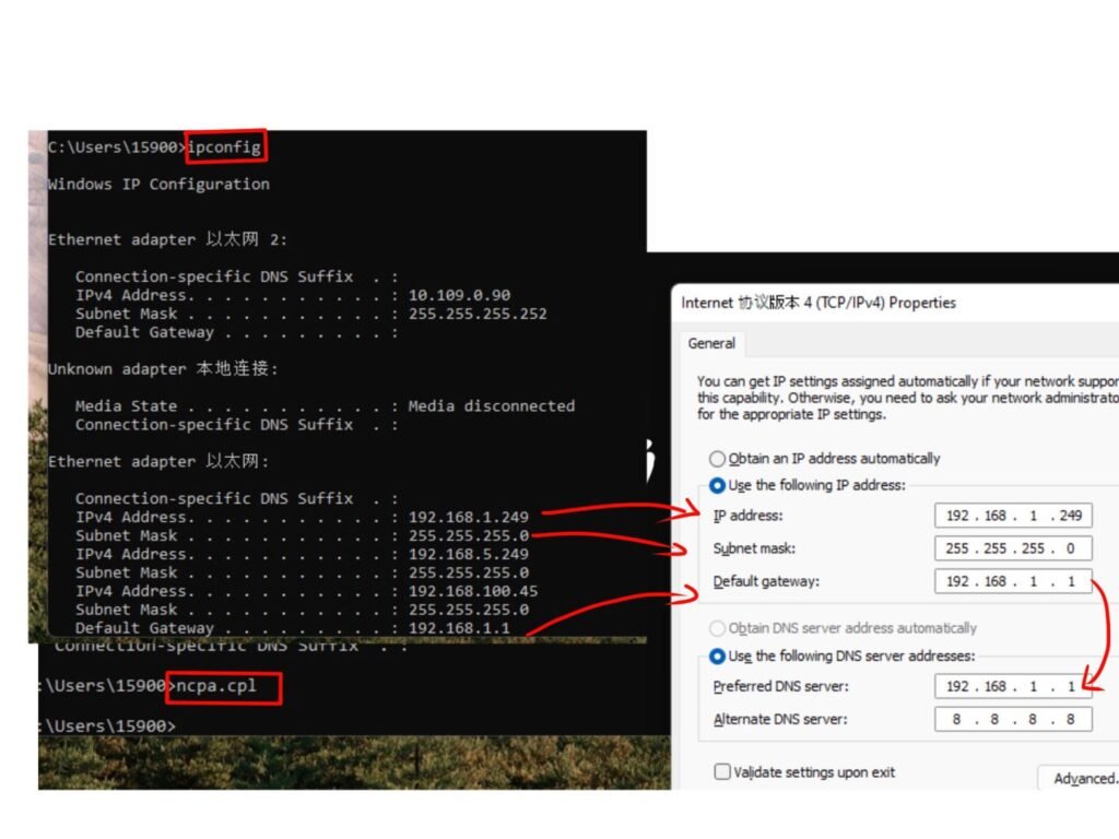 5) Type in IP address, subnet mask and default gateway found.