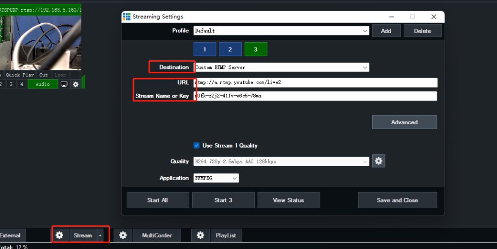 Step 3: Click the Stream button and select the destination as seen below. Paste the URL and Stream Name or Key.